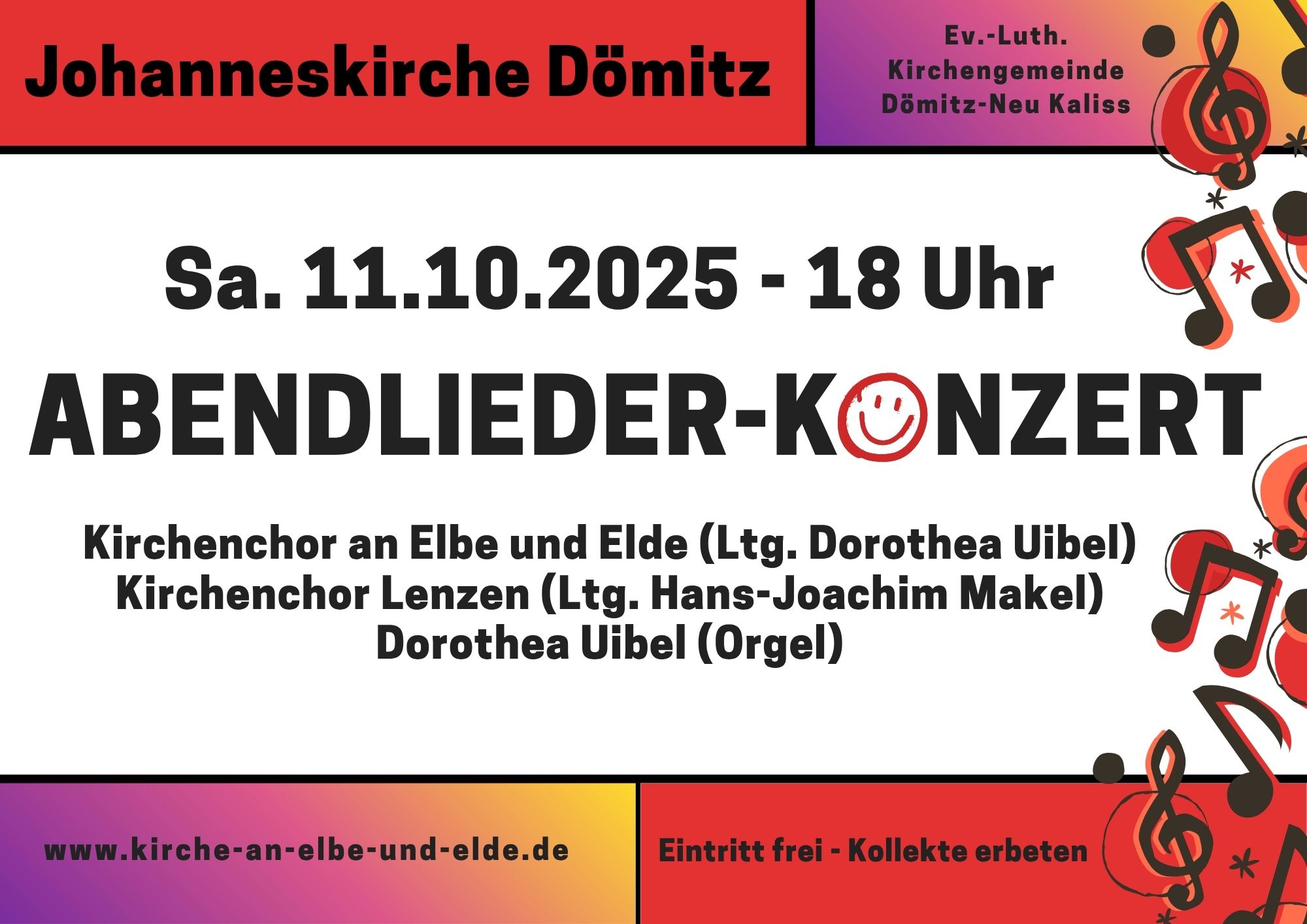 Kirchenchor an Elbe und Elde (Ltg. Dorothea Uibel) Kirchenchor Lenzen (Ltg. Hans-Joachim Makel) Dorothea Uibel (Orgel) Eintritt frei – Kollekte erbeten