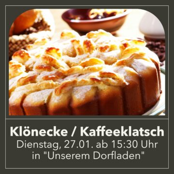 Unsere nächste Klönecke mit frischem Kuchen und Kaffee findet am nächsten Dienstag in „Unserem Dorfladen“ statt.