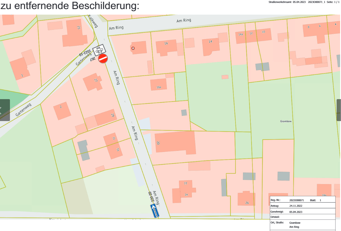 Nachdem die Gemeindevertretung bereits Ende 2022 die Aufhebung der Einbahnstraße im Abschnitt der Straße „Am Ring“ gegenüber der Gaststätte Moorkrug beschlossen hatte, wurde nun die daraus resultierende verkehrsrechtliche Anordnung des Landkreises NWM umgesetzt. Die entsprechenden Verkehrszeichen wurden entfernt.