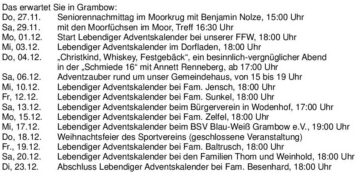 Am Montag, dem 1.12., startet dann unser “Lebendiger Adventskalender“ und dazwischen gibt es noch eine Reihe von Veranstaltungen. Wir wünschen Ihnen eine besinnliche Weihnachtszeit.